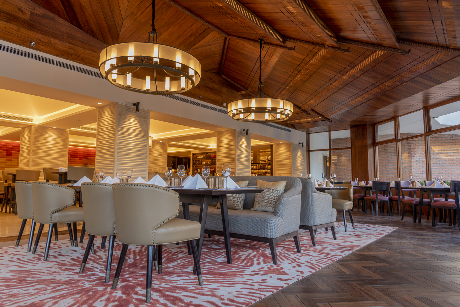 Spice Room is an Innately Indian Fine Dining Destination. Set amid verdant gardens, Spice Room combines luxe, lit interiors with a high-class, yet an inclusive fine dining restaurant. The wooden interiors and floors dedicated to the traditional Newari carving have been retained whereas the wall pattern redefines the theme of Spice Room. Renowned for its authenticity, the destination is a harmony of tastes expressed through a signature medley of colours and unparalleled flavours.